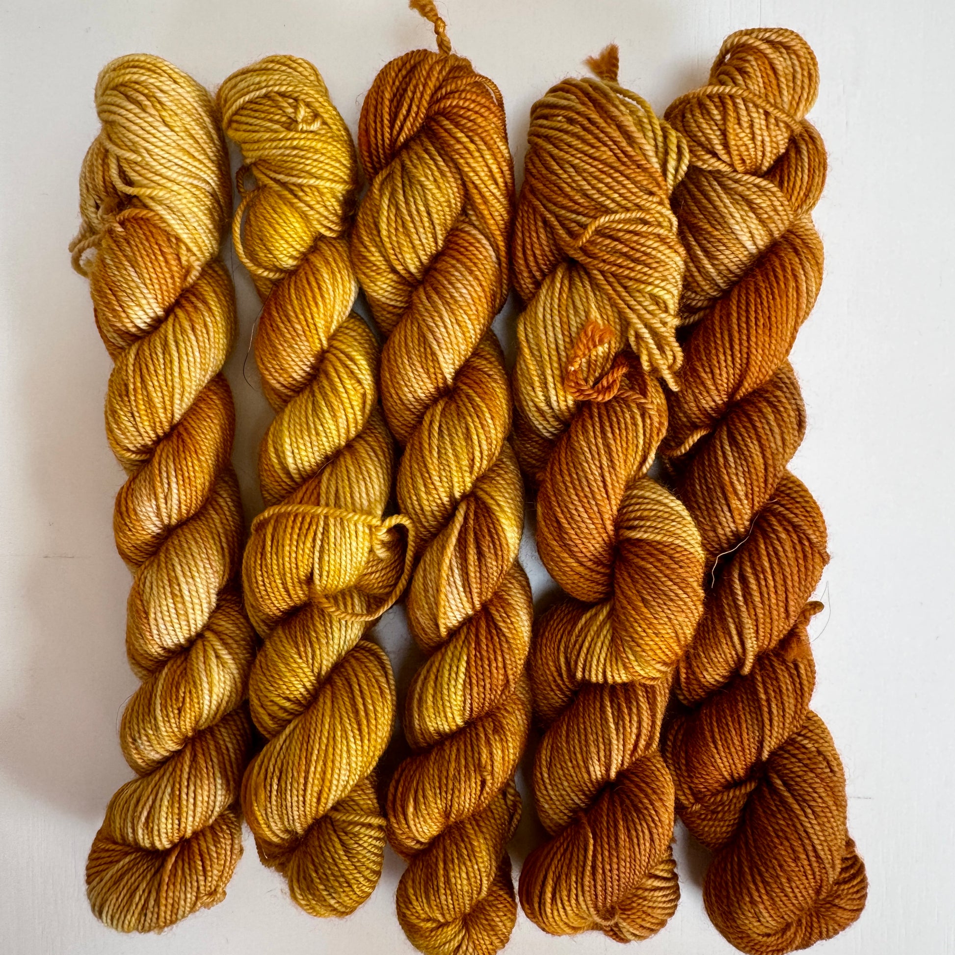 Set of five 20g skeins, fade dyed. Named for the Flower Fairy book read to me by my Mummy