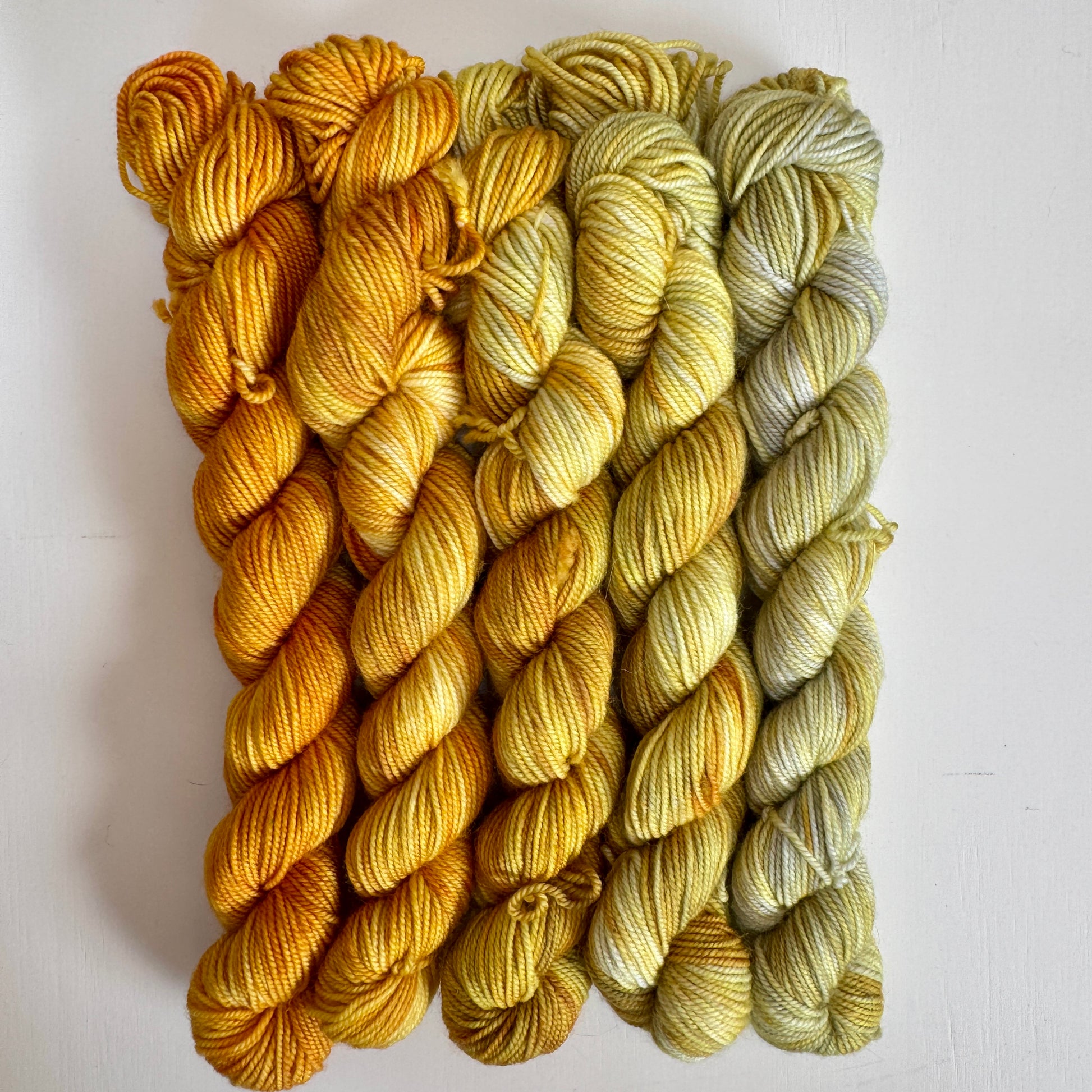 Set of five 20g skeins, fade dyed. Named for the Flower Fairy book read to me by my Mummy