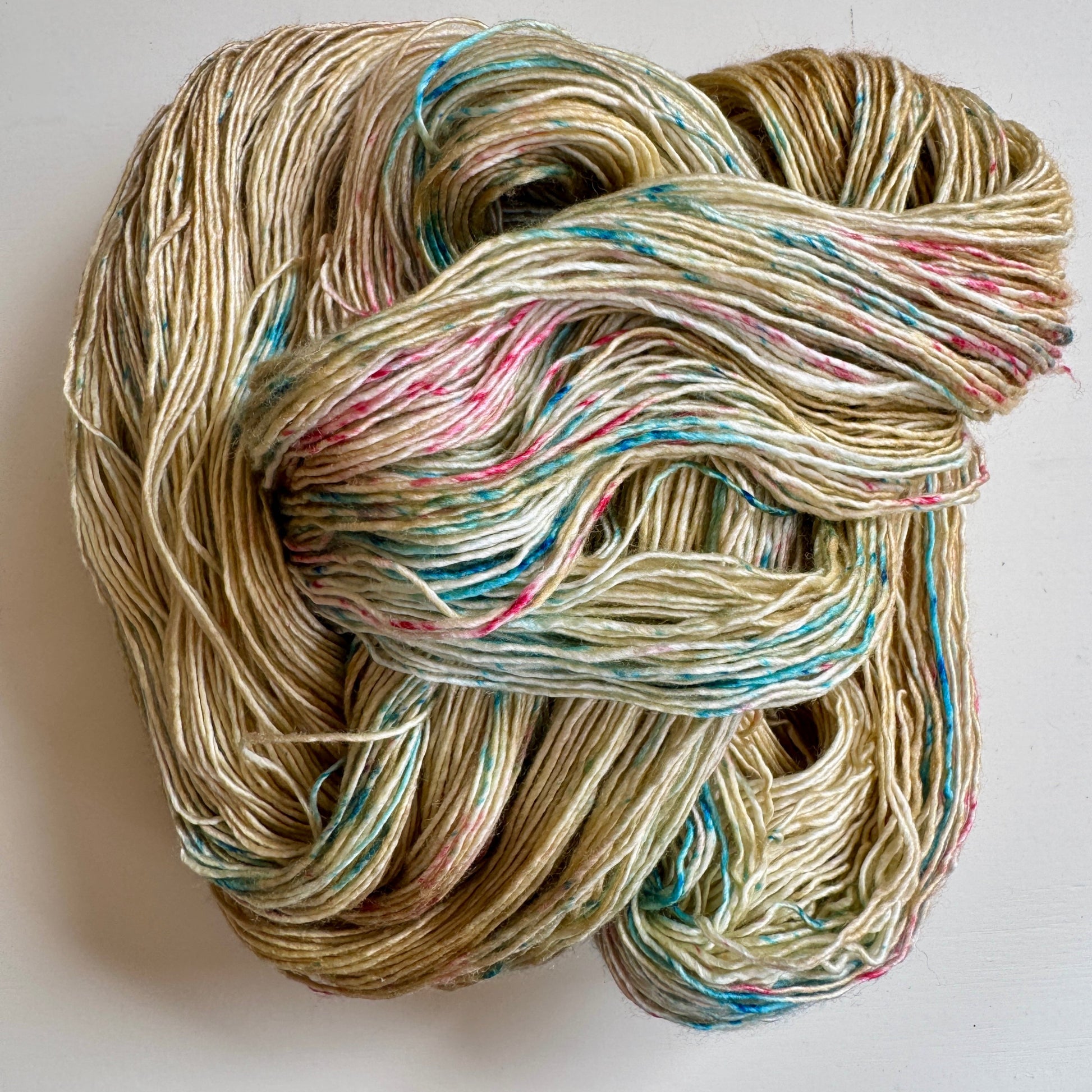 The addition of silk to the merino makes the yarn smoother and adds a shine. It also adds strength to this construction. The knitted fabric is crisp, and the stitch definition is really good. It works well in lace patterns and is great for shawls and accessories where you really want to see the stitch definition.