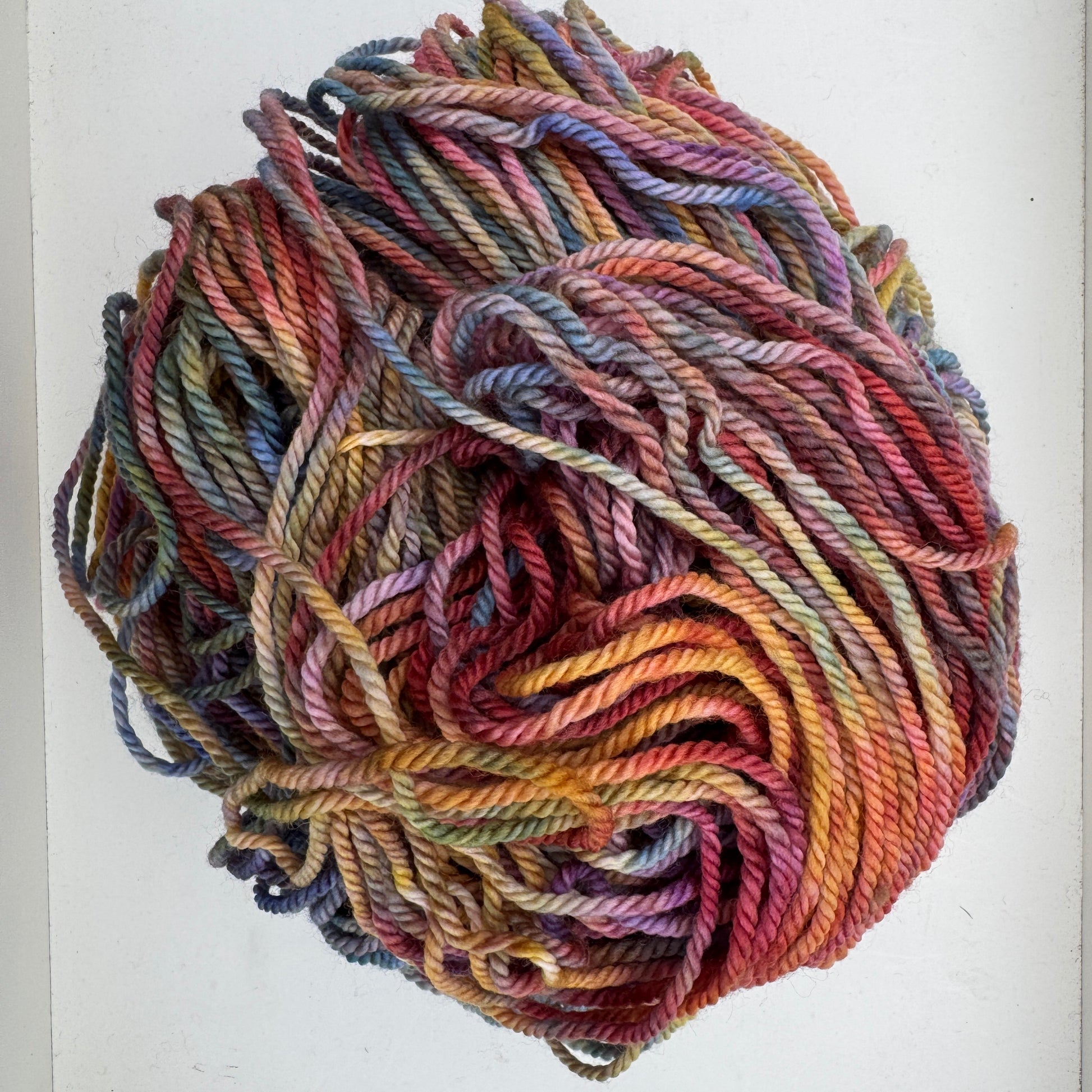 A super soft aran with a lovely twist, the knitted fabric has a classic aran look, it’s great for cabling. When a 4.5mm needle was used to compensate for the superwash stretch it knitted in to a lovely drapey fabric, this would also work on a 4mm, especially for rib.