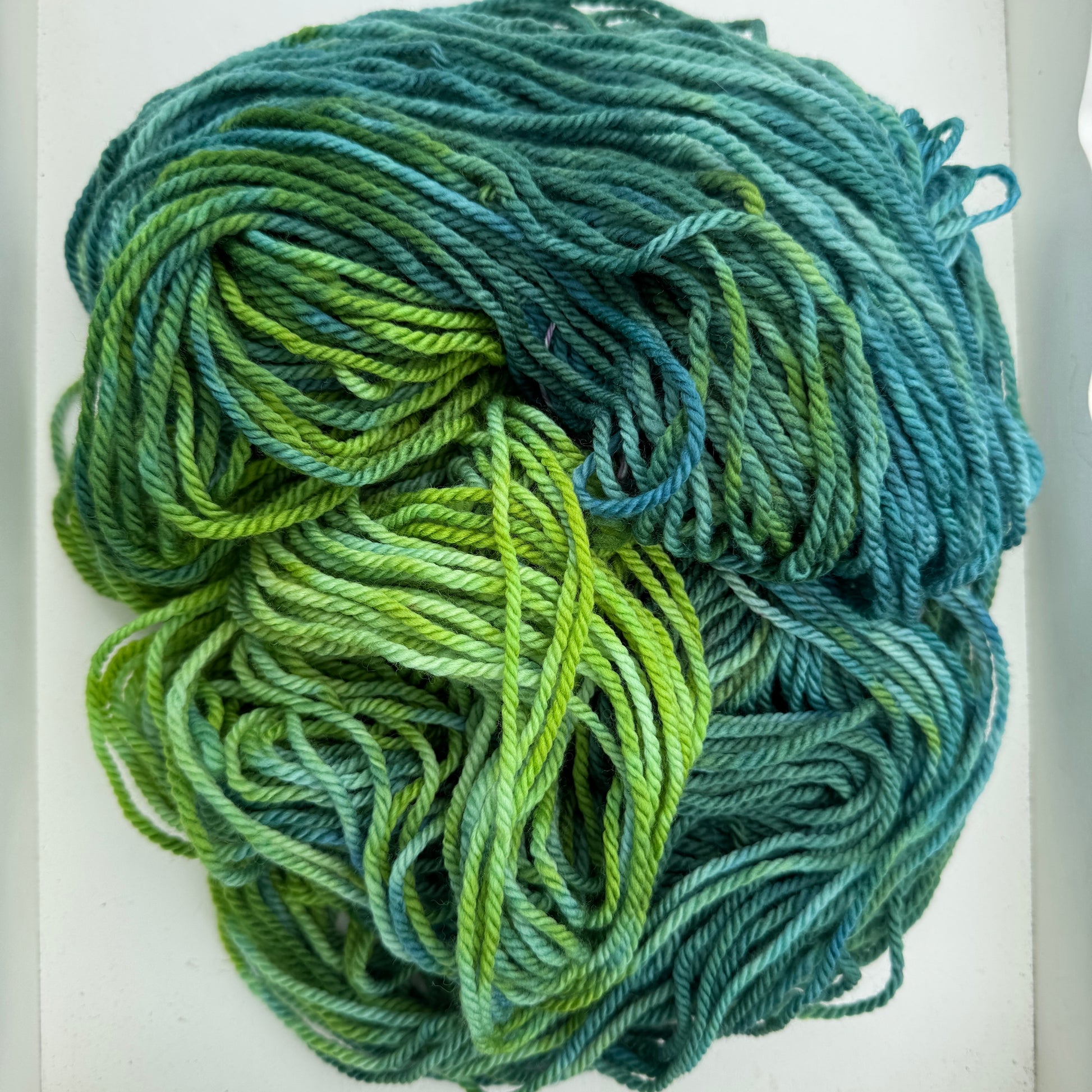 A super soft aran with a lovely twist, the knitted fabric has a classic aran look, it’s great for cabling. When a 4.5mm needle was used to compensate for the superwash stretch it knitted in to a lovely drapey fabric, this would also work on a 4mm, especially for rib.