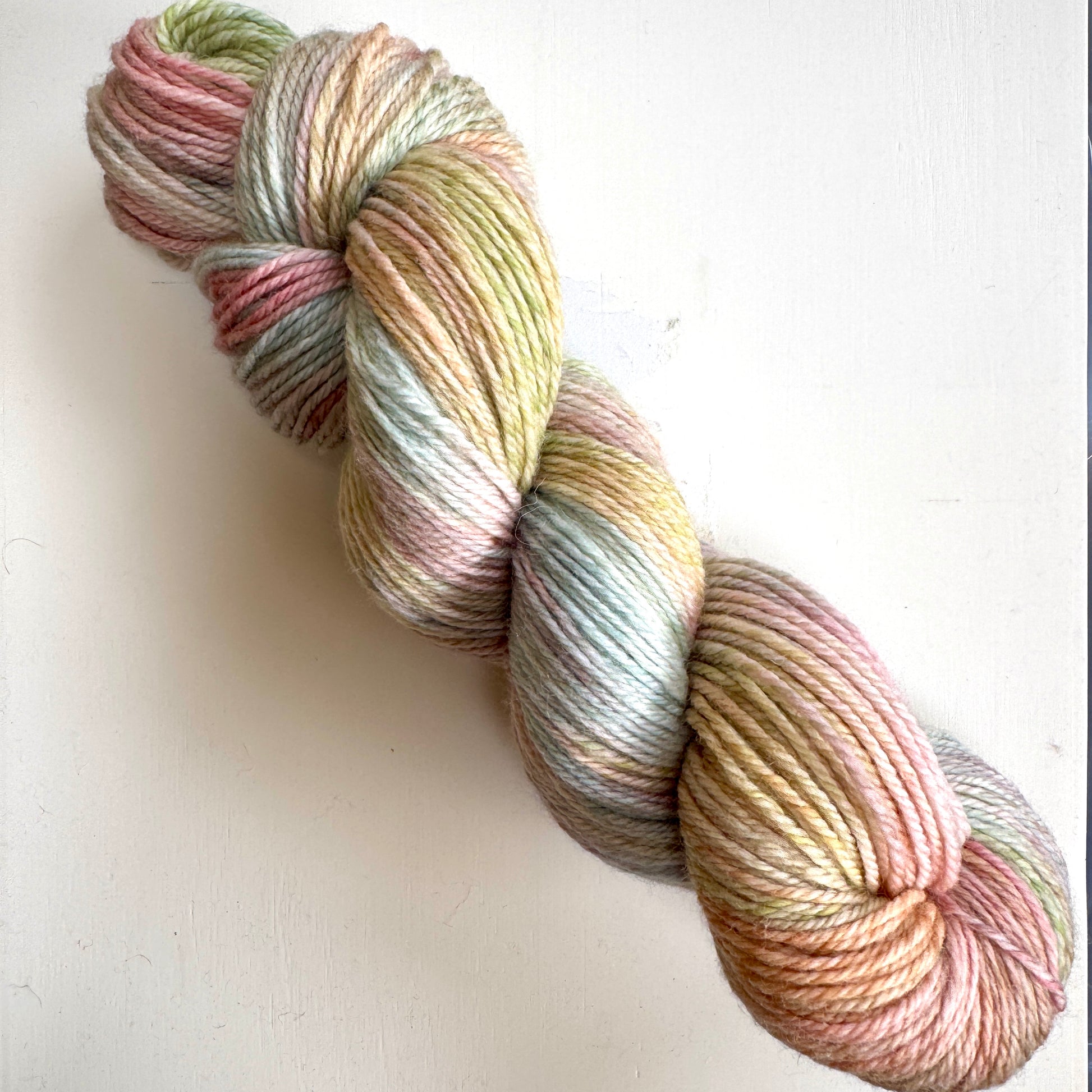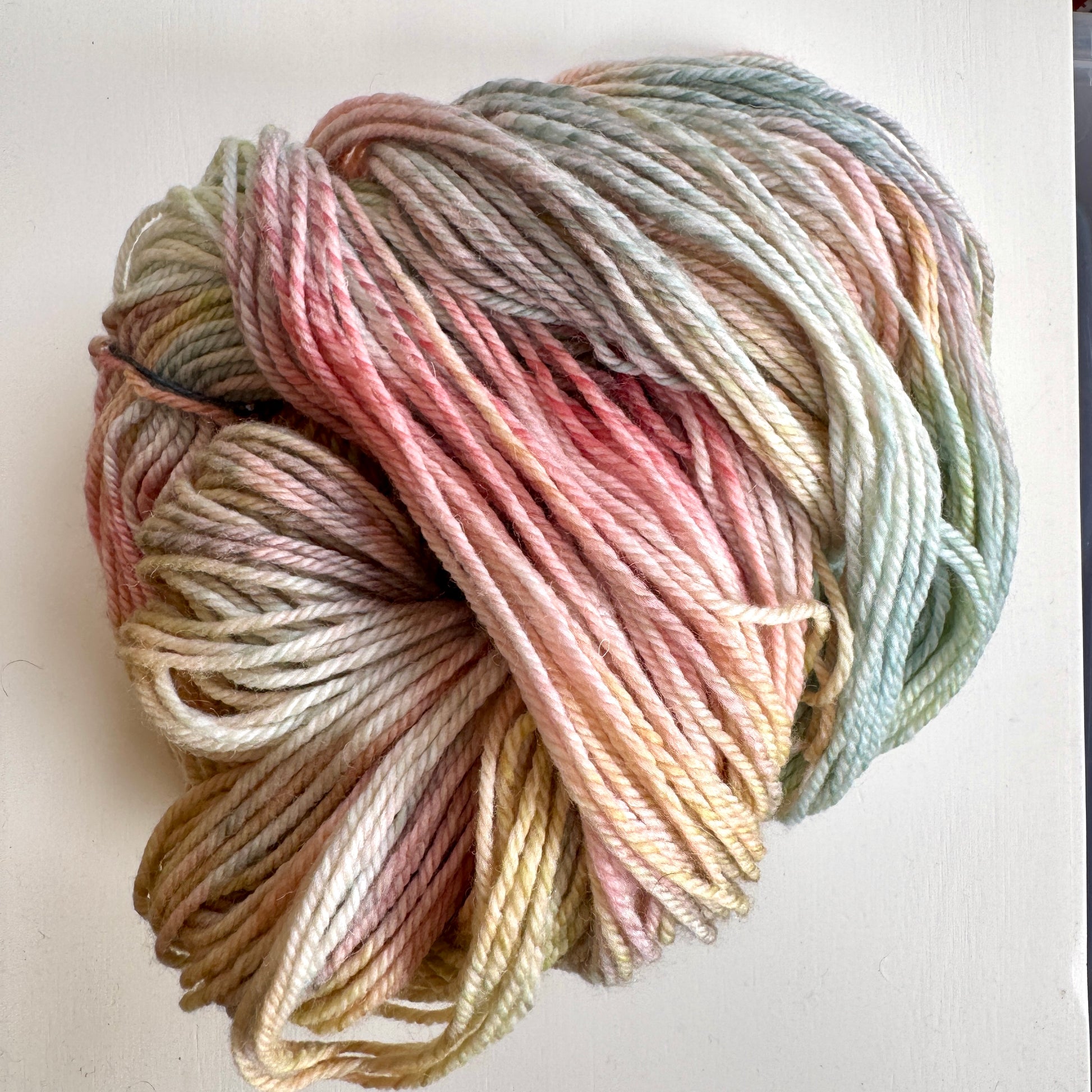 This yarn is a 3ply construction (1 ply of superwash merino and 2 plies of non-superwash merino). The superwash merino takes the dye more intensely than the non-superwash merino, resulting in a barber pole effect when dyed. The fabric once knitted is lovely and bouncy and would make a great sweater yarn, especially dyed with semi solids to emphasise the barber pole patterning.