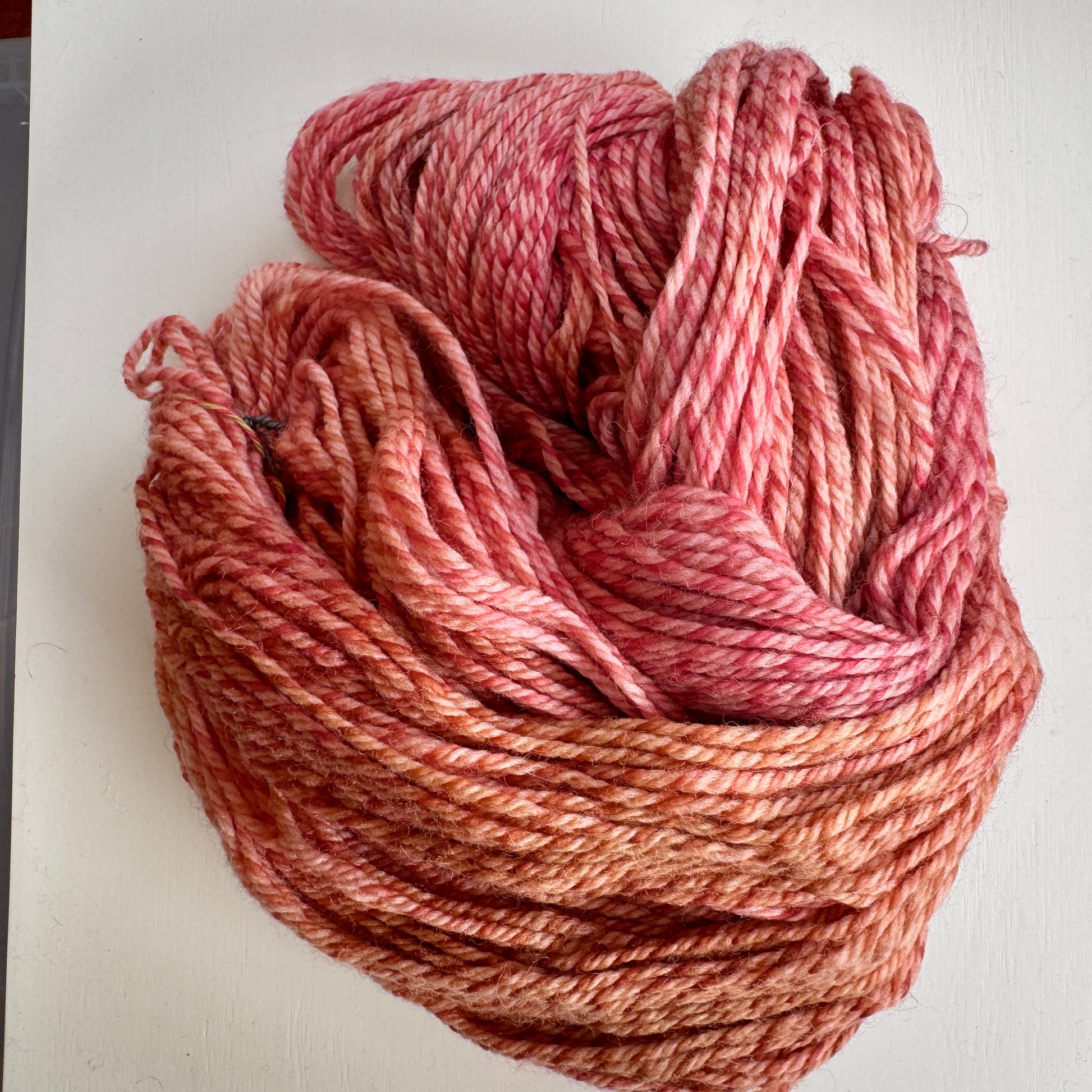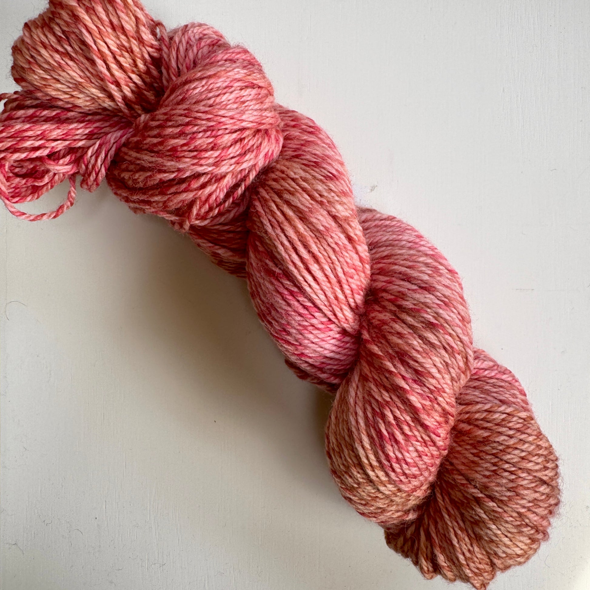 This yarn is a 3ply construction (1 ply of superwash merino and 2 plies of non-superwash merino). The superwash merino takes the dye more intensely than the non-superwash merino, resulting in a barber pole effect when dyed. The fabric once knitted is lovely and bouncy and would make a great sweater yarn, especially dyed with semi solids to emphasise the barber pole patterning.