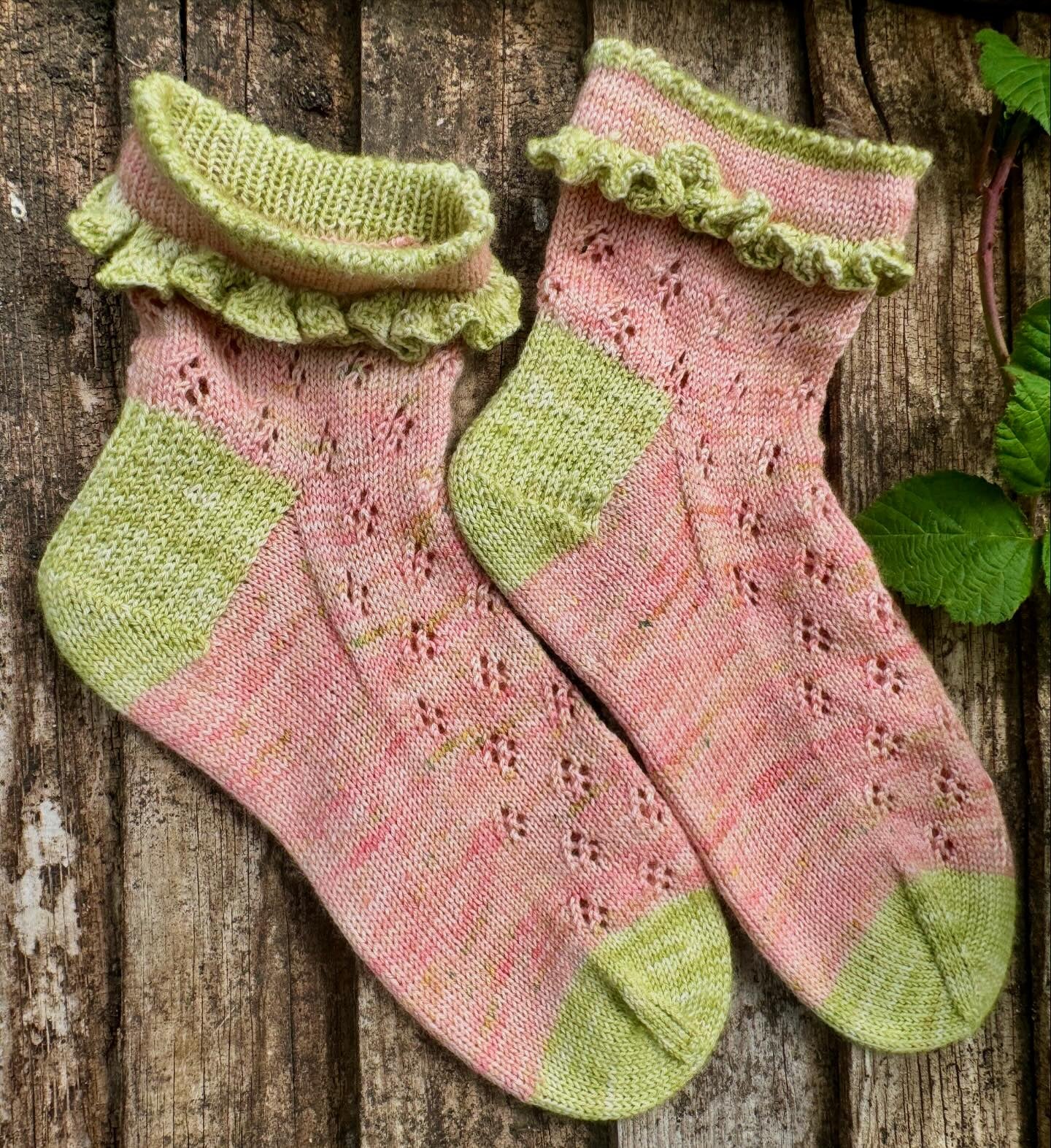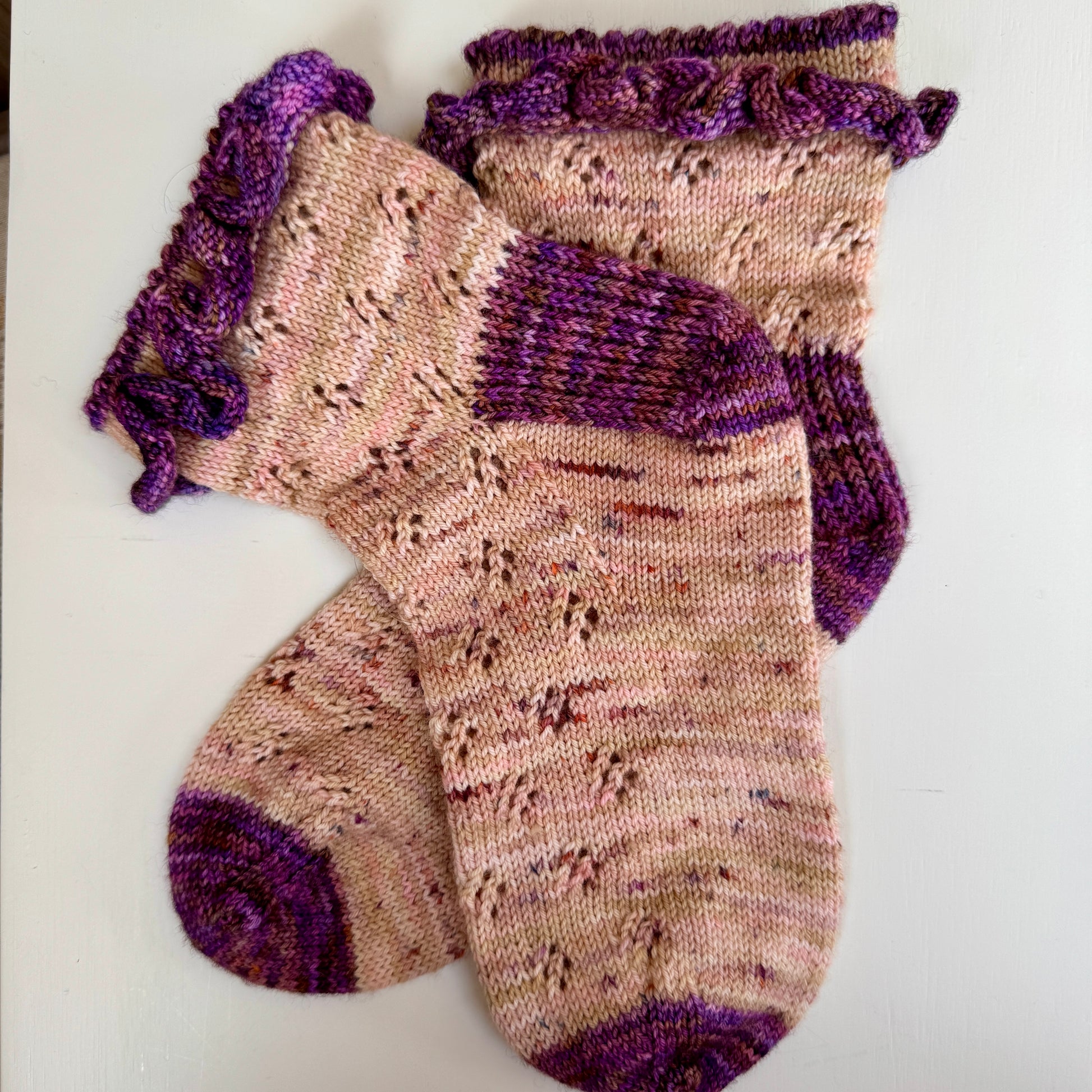 Knitted in 4 ply (fingering) yarn, these pretty ankle socks are knitted from the cuff down using a provisional cast on. The ribbed cuffs are folded with a picot edge and a ruffle added around the join. The socks have a simple lace pattern with a plain sole, instructions are given for magic loop method.