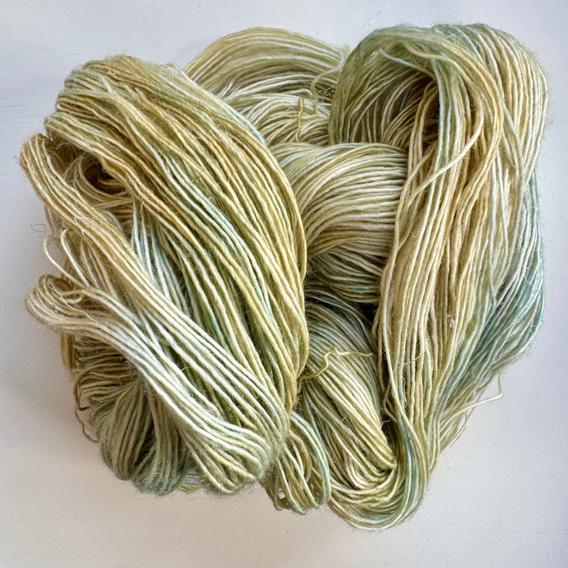 This rustic single ply contains linen, which adds an airy nature to the fabric once knitted and adds a lovely matt finish. The fabric holds its shape really nicely and would work very well for accessories and sweaters.