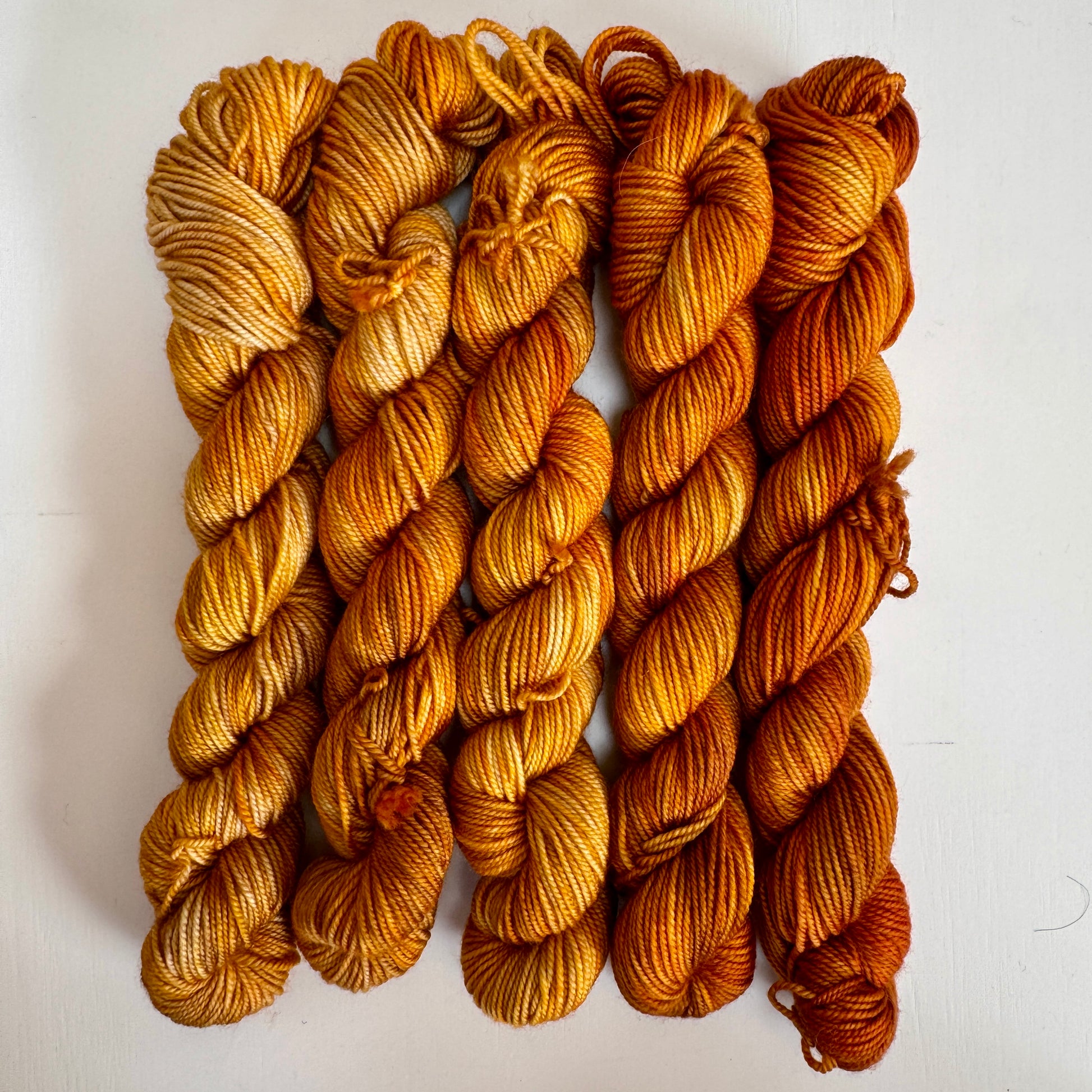 Set of five 20g skeins, fade dyed. Named for the Flower Fairy book read to me by my Mummy