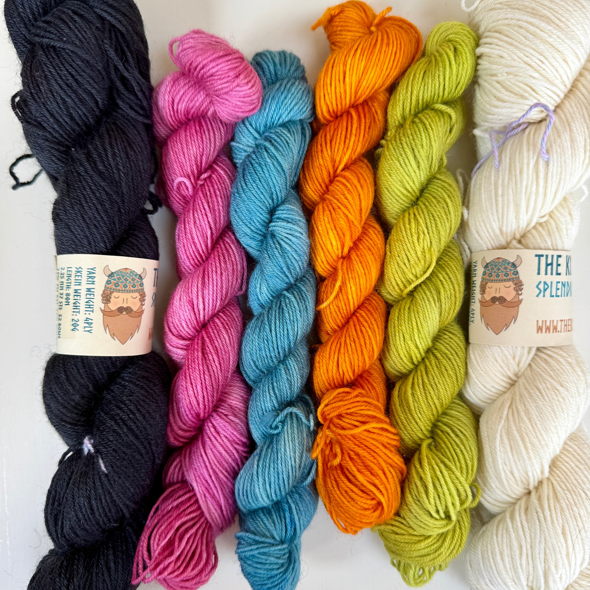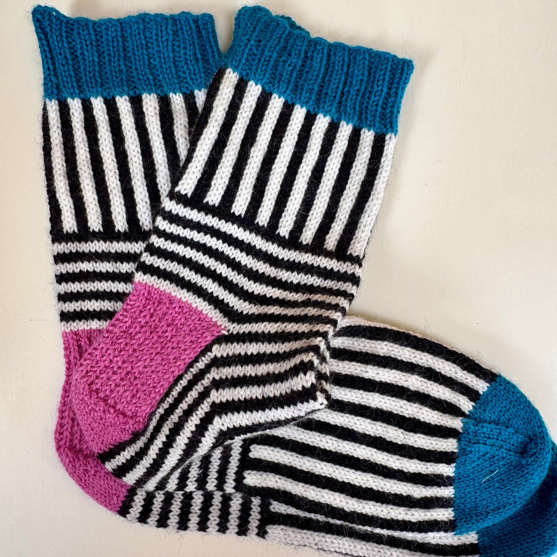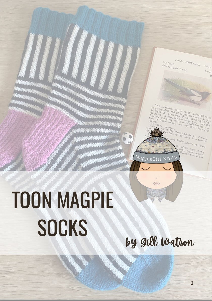 Another stunning sock pattern by MagpieGill Knits, black and white stripes with coloured cuffs, heel and toe. The knit contains 50g black, 50g white and two coloured 20g skeins of your choice and a printed pattern.