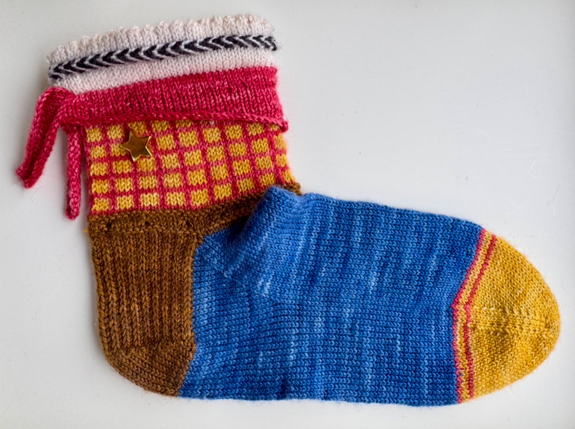 Kit includes: Printed pattern with full instructions, 120g hand dyed 4 ply sock yarn, (75% Merino 25% Nylon) & Gold star shaped button